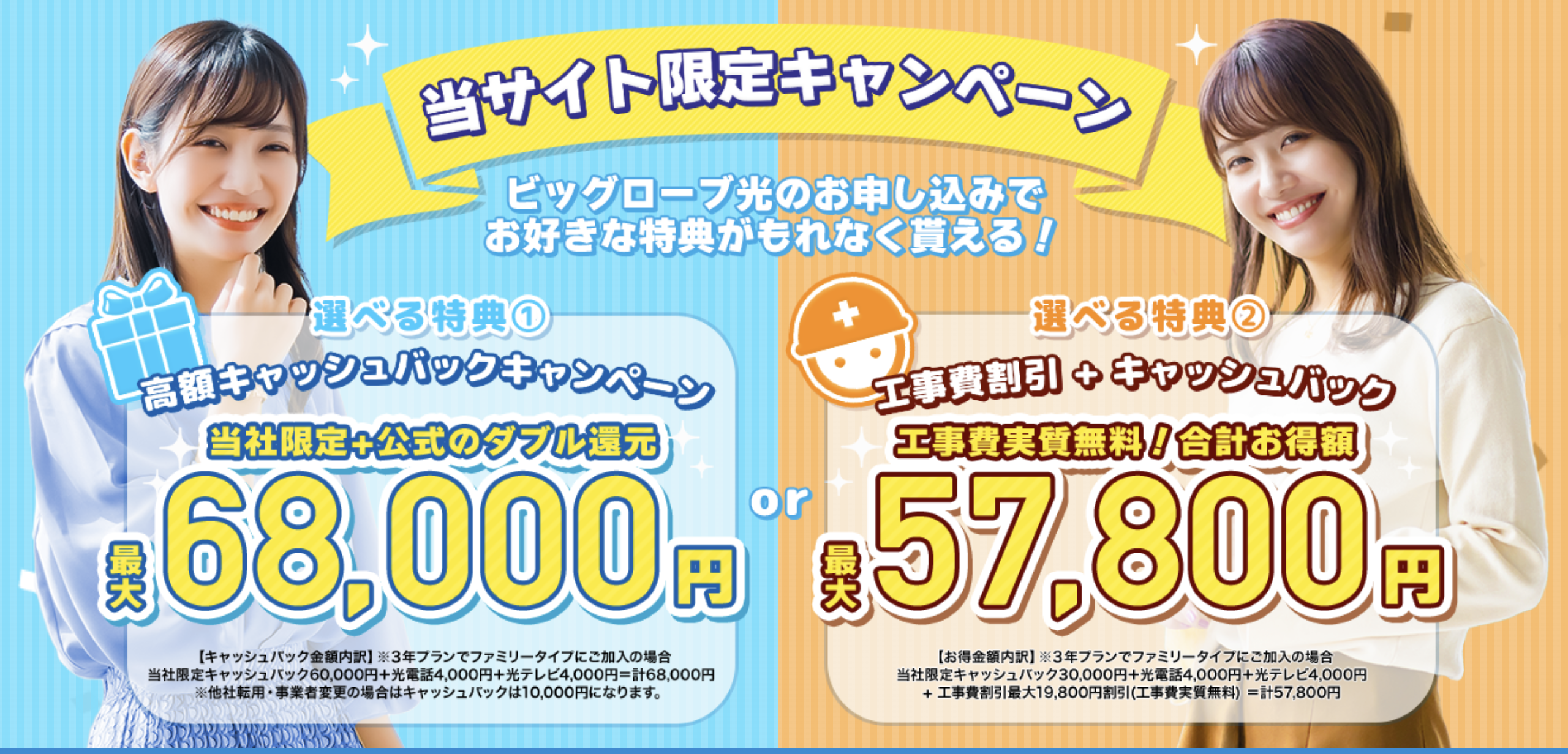 ビッグローブ光は当社選べるキャンペーン2を適用頂くと、工事費実質無料で導入できます。