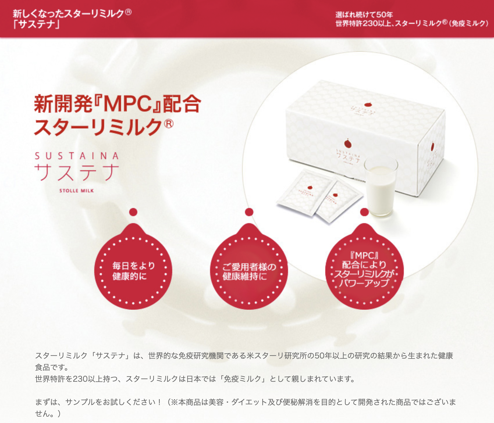 スターリミルク「サステナ」は、世界的な免疫研究機関である米スターリ研究所の50年以上の研究の結果から生まれた健康食品です。